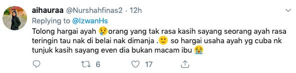 Menerusi perkongsian yang ditularkan di Twitter milik Izwan di Malaysia, rata-rata netizen telah menzahirkan pelbagai maklum balas. Rata-rata memberitahu bahawa anak kepada lelaki itu amat beruntung kerana mempunyai ayah yang sanggup bekorban demi kebahagiaan dirinya.