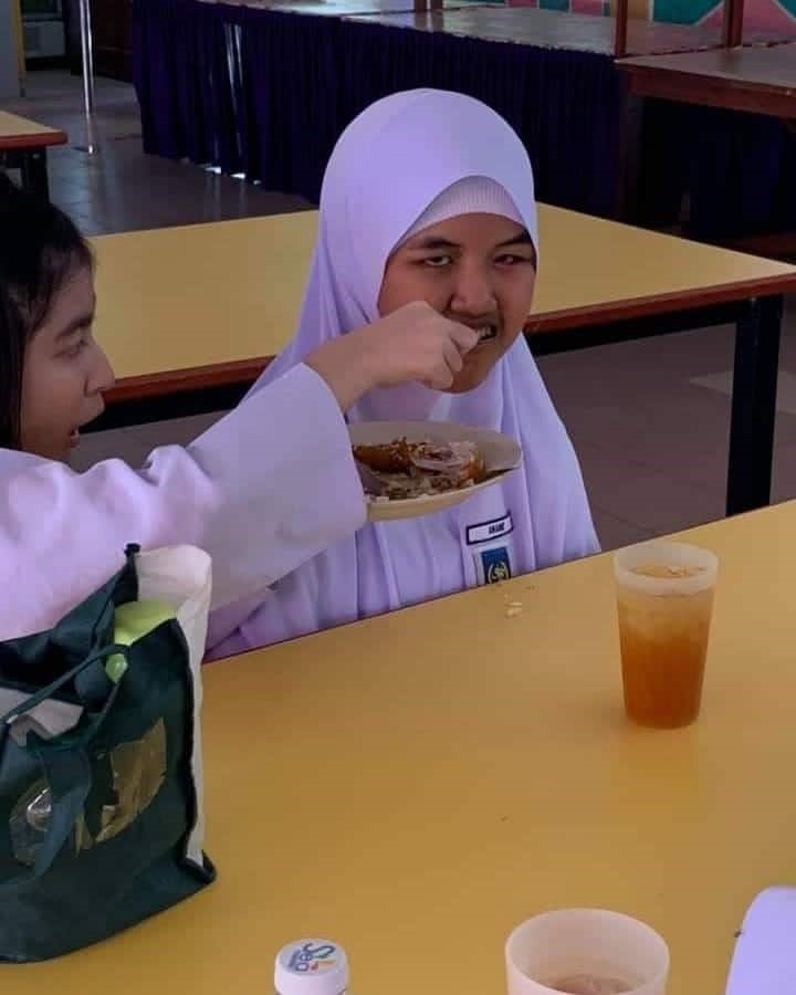 Situasi comel itu telah medapat perhatian ramai kerana kedua-dua pelajar tersebut merupakan murid kelas pendidikan khas. Mereka dilihat begitu akrab dan salah seorang daripadanya tidak kekok menyuap makanan ke mulut rakannya.