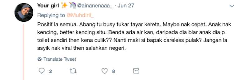 “Seorang bapa pergi pam tayar, dia biarkan dua anak dia kencing dekat tempat cuci tangan tu.