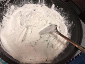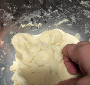 Masukkan tepung dan santan sedikit demi sedikit sambil diuli sehingga menjadi doh. Kuih bangkit ini kena banyak uli dan uli dengan tapak tangan sehingga tidak melekat pada tangan.