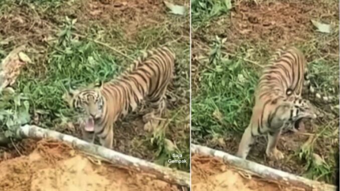 Kemunculan harimau itu seakan-akan mahu menghalang para pekerja daripada menebang pokok-pokok di dalam hutan berkenaan.