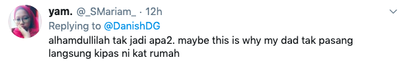 Tambah Danish lagi, dia tidak dapat membayangkan apa yang terjadi kepada ibunya jika kipas tersebut jatuh ketika wanita itu sedang tidur atau berbaring di katil. Hal ini kerana kipas tersebut jatuh betul-betul di bantal ibunya selalu gunakan.