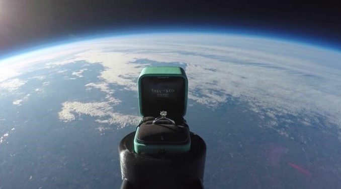Setelah setahun merancang, cincin pertunangan jenama Tiffany & Co. berserta dengan kotaknya dibawa naik sehingga 100,000 kaki dari Bumi.