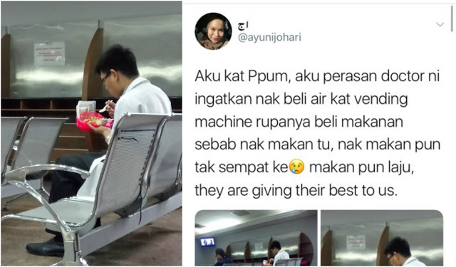 Baru-baru ini seorang wanita telah berkongsi sekeping foto di laman twitternya. Gambar itu menunjukkan seorang lelaki yang berpakaian doktor yang duduk diruangan menunggu sambil memakan makanan yang yang dibawa.