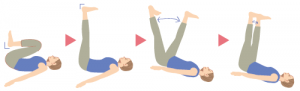 Dalam keadaan berbaring, angkat kedua kaki ke atas. Kedua tangan berada di sisi menekan lantai. Kemudian, lakukan gerakan seperti dalam gambar di bawah ini.