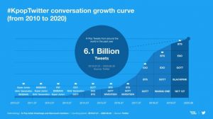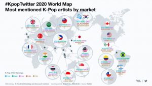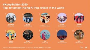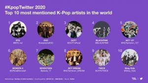 Daripada carta itu juga, BTS adalah kumpulan K-Pop yang paling banyak di tweet, diikuti EXO, BLACKPINK, TWICE, TXT, SEVENTEEN, GOT7, ATEEZ, Stray Kids, dan NU’EST.