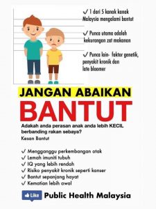Menurut Public Health Malaysia, statistik menunjukkan satu daripada lima orang kanak-kanak di Malaysia mengalami masalah bantut, akibat daripada punca utama iaitu kekurangan zat makanan.