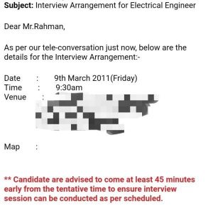 “Sembilan tahun lepas guys! Bukan sembilan hari lepas! Kenapa aku ingat sangat interview session ni? Ikuti kisah aku kali ni. Kalau korang perasan, dalam email tu siap font merah plus bold lagi. ‘Candidate are advised to come at least 45 minutes early and bla…bla‘