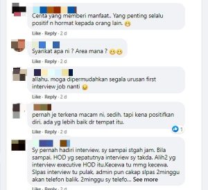 “Aku jawab balik dengan tenang ‘terima kasih atas pengalaman temuduga yang diberikan… semoga encik akan jumpa candidate yang sesuai untuk jawatan ini’. Aku pun salam dengan interviewer dan keluar dari bilik temuduga. Kecewa? Of course la kecewa,” tulisnya.