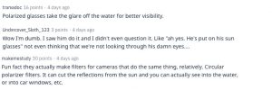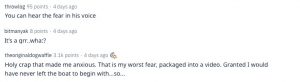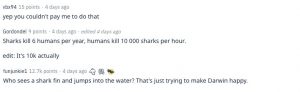 Menurut individu itu jerung jenis itu tidak berbahaya. Namun begitu, lelaki itu bergegas kembali ke bot kerana jerung itu bukan dari spesis yang didakwa di awalnya. Berikut adalah video lelaki terjun dari bot untuk berenang bersama jerung itu: Video tersebut telah meraih perhatian ramai. Rata-rata pengguna laman tersebut yang telah menonton video tersebut terkejut dan meninggalkan reaksi mereka di ruangan komen seperti berikut: