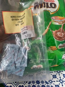 Sewaktu tuang serbuk minuman dalam balang sama ada Milo, Nescafe atau apa juga serbuk termasuklah kopi, teh dan sebagainya letak sekali satu paket penyerap oksigen ini.