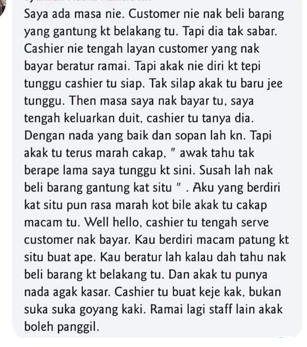 Dan akak tu punya nada agak kasar. Cashier tu buat kerja kak, bukan suka-suka goyang kaki. Ramai lagi staff lain akak boleh panggil.