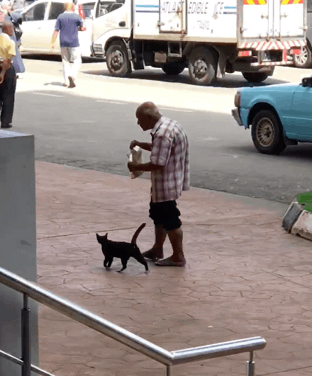 Mungkin kerana sudah mengenali lelaki tersebut, kucing itu seakan manja dan ternanti-nanti kehadiran individu yang akan memberinya rezeki.