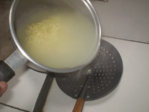 3. Rebus air dalam periuk yg lain hingga mendidih, kemudian masukkan mi tadi ke dalam air mendidih panas itu dan matikan api.