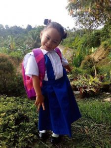 Dalam gambar pertama, kanak-kanak perempuan sempat tersenyum meleret dengan pakaian seragamnya yang masih bersih dan kemas bersedia untuk ke sekolah.