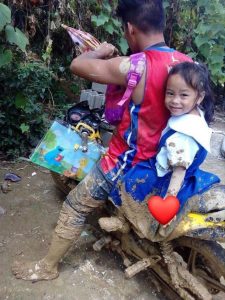 Namun, dalam gambar kedua dilihat kanak-kanak itu yang menaiki motorsikal bersama bapanya, habis berlumpur tetapi dia tetap tersenyum girang mahu pergi ke sekolah.