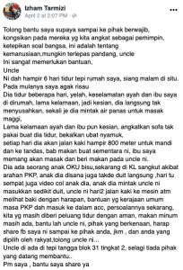 Kisah sedih tersebut dikongsikan oleh seorang pengguna Facebook dikenali sebagai Izham Tarmizi apabila membantu seorang warga emas yang tinggal di tepi tangga kawasan perumahan PPR.