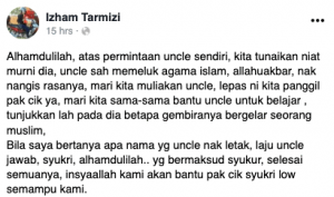 Dalam perkongsian tersebut, apa yang paling mengharukan adalah apabila lelaki Cina itu dengan terbuka hati telah memeluk Islam sejurus selepas dibantu dan ditempatkan di JKM.