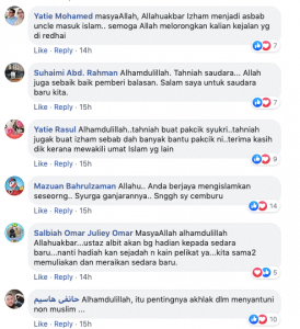 Sehubungan dengan perkongsian tersebut, rata-rata warganet telah meninggalkan komen positif diatas muat naik itu. mereka juga memuji dan mengucapkan ribuan terima kasih kepada pemuda tersebut yang dengan gigih membantu lelaki Cina itu tanpa sebarang prajudis.