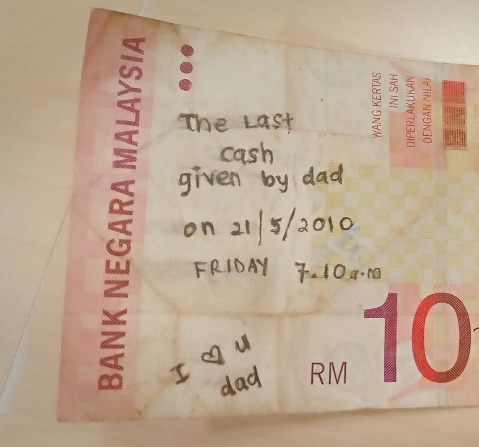 Foto wang kertas RM10 yang dikongsikan oleh pemilik akaun Hyza Ezany itu tertulis nota bahawa ia adalah wang terakhir pemberian ayahnya pada tarikh 21/5/2010 pada jam 7.10 pagi.