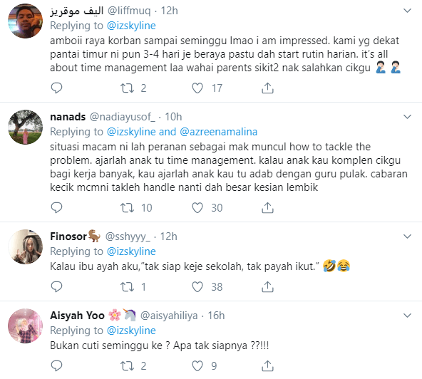 Kisah yang dikongsikan izskyline di twitter ni pulak sedikit berbeza bila kawannya yang merupakan seorang cikgu, kena ‘bebel’ dengan emak kepada salah seorangnya hanya sebab homework yang diberikan kepada budak tersebut.