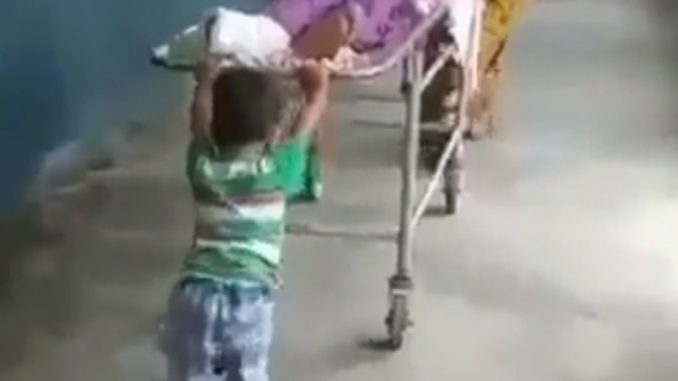NEW DELHI: Seorang budak lelaki terpaksa menolak pengusung untuk memindahkan bapanya dari satu wad ke wad lain di hospital di Deoria, Uttar Pradesh, India.