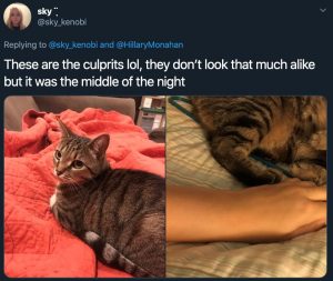 Namun tidak lama selepas itu, kucingnya berwarna hitam putih juga telah kembali pulang ke rumah, membuatkan dirinya kini ada dua ekor kucing seiras di rumah!