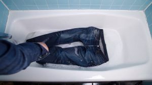 Bagi memastikan semua kekotoran terhapus, sebaiknya rendam jeans sekurang-kurangnya 45 minit terlebih dahulu sebelum dicuci. Jika rajin, gunakan kaki untuk memijak jeans yang direndam sebagai cara mengeluarkan kotoran. Fuh! Sambil mencuci tu kita bersenam.
