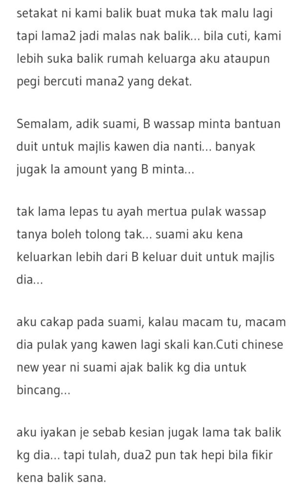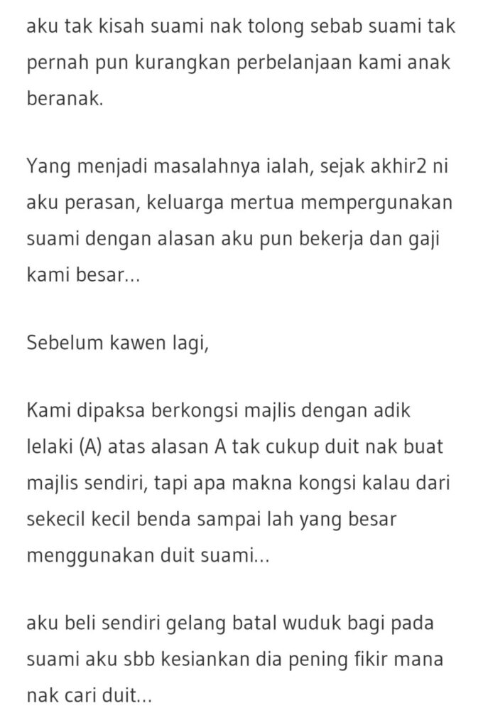 Suami anak sulung, adik beradik dia yang lain hanyalah tamat spm dan bekerja biasa… dari dulu lagi, adik beradik suami sangat mengharapkan pertolongan suami setiap bulan…